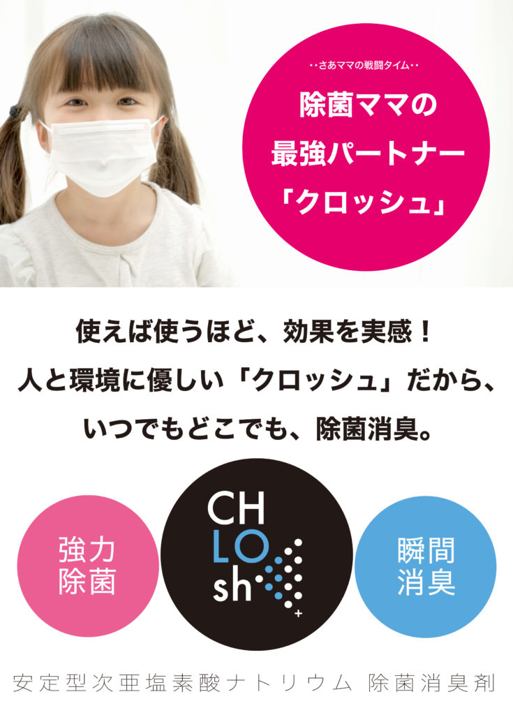 クロッシュは非刺激性で希釈調整済みなので、 市販の次亜塩素酸ナトリウム・漂白剤等の希釈過程における危険性も なく、そのまま直ぐにお使いいただけます。